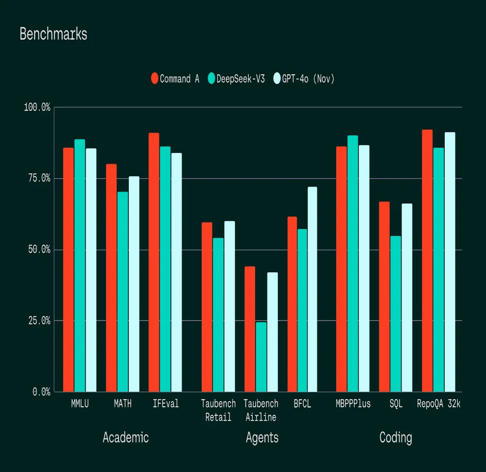 La licorne canadienne Cohere a récemment dévoilé “Command A”, la dernière version de son modèle phare. Spécialement conçu, comme ses prédécesseurs, pour répondre aux besoins des entreprises, ce LLM de 111 milliards de paramètres, qui combine performance et efficacité énergétique, rivalise avec des modèles de premier plan tels que GPT-4o et DeepSeek-V3.