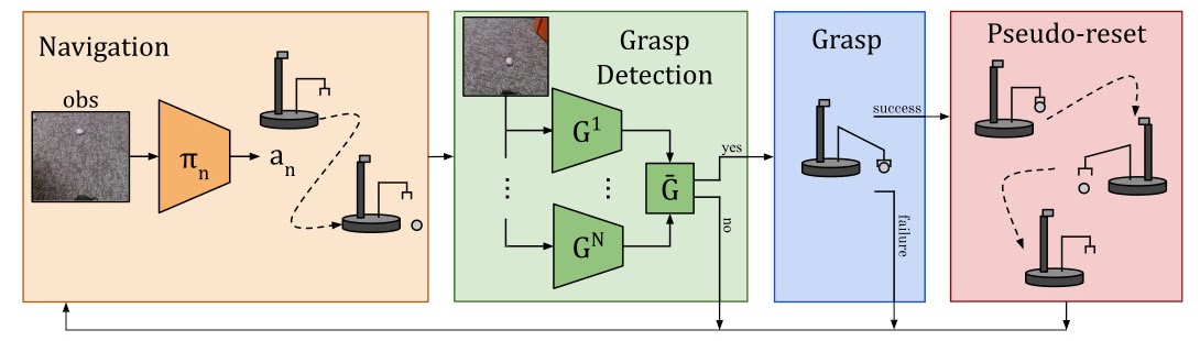 Ils ont conçu un système d’apprentissage, ReLMM, qui atteint cet objectif grâce à une politique modulaire de saisie et de navigation où l’incertitude sur la politique de préhension conduit à l’exploration, et la navigation n’est récompensée que par le succès de la saisie.
