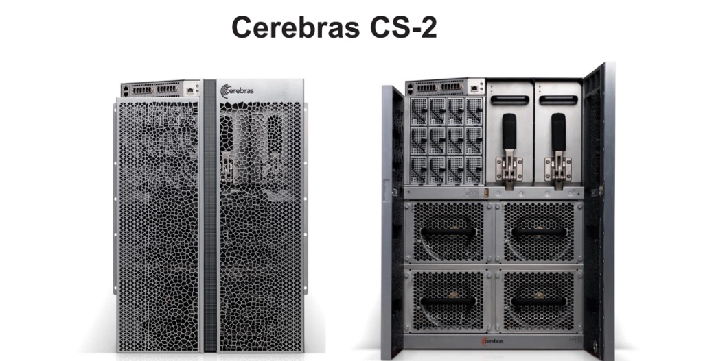On retrouve 40 Go de mémoire intégré (SRAM), offre une bande passante mémoire de 20 Po/s et bénéficie d’une interconnexion de 220 Pb/s. Les E/S comprennent 12 ports GbE, soit une bande passante de 1,2 Tb/s. Un seul système engloutit jusqu’à 23 kW. Afin de fonctionner, la société intègre le processeur dans le système Cerebras CS-2 dont on retrouve une illustration ci-dessous :