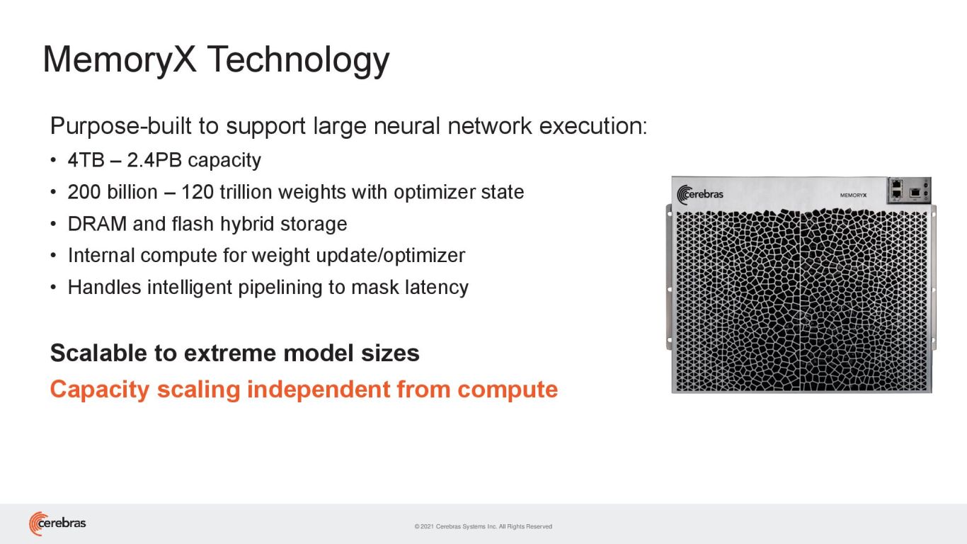 Pour construire un réseau comme celui-ci, Cerebras a bâti un système de parallélisme par distribution de données pour offrir une mise à l'échelle des performances linéaires. Ainsi, les paramètres du modèle sont stockés dans des blocs MemoryX pouvant contenir entre 4 To et 2,4 Po de donnés. Chaque bloc pilote jusqu’à 32 Cerebras CS-2 et intègre de la mémoire RAM et Flash pour conserver les modèles et paramètres hors des processeurs, ce qui permet de libérer la mémoire interne de chaque puce pour exécuter les calculs.
