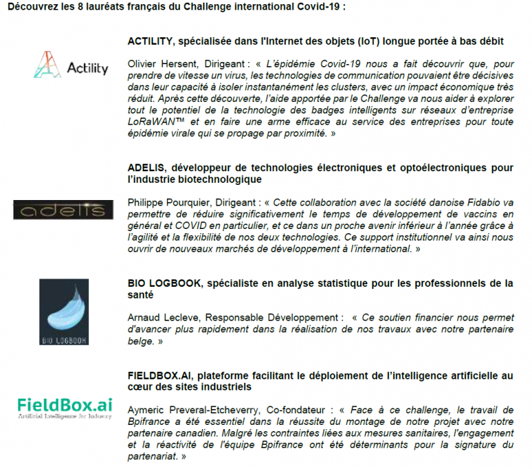 Bpifrance a annoncé ce jour les lauréats du Challenge international Covid-19. Suite à l'appel à projets ouvert du 15 avril au 15 mai 2020, via le réseau intergouvernemental EUREKA, 8 startups et PME françaises ont été sélectionnées : Actility, Adelis, Bio Logbook, FieldBox.ai, MyDataModels, Partelec, Scaleo Industries et Virtexx.