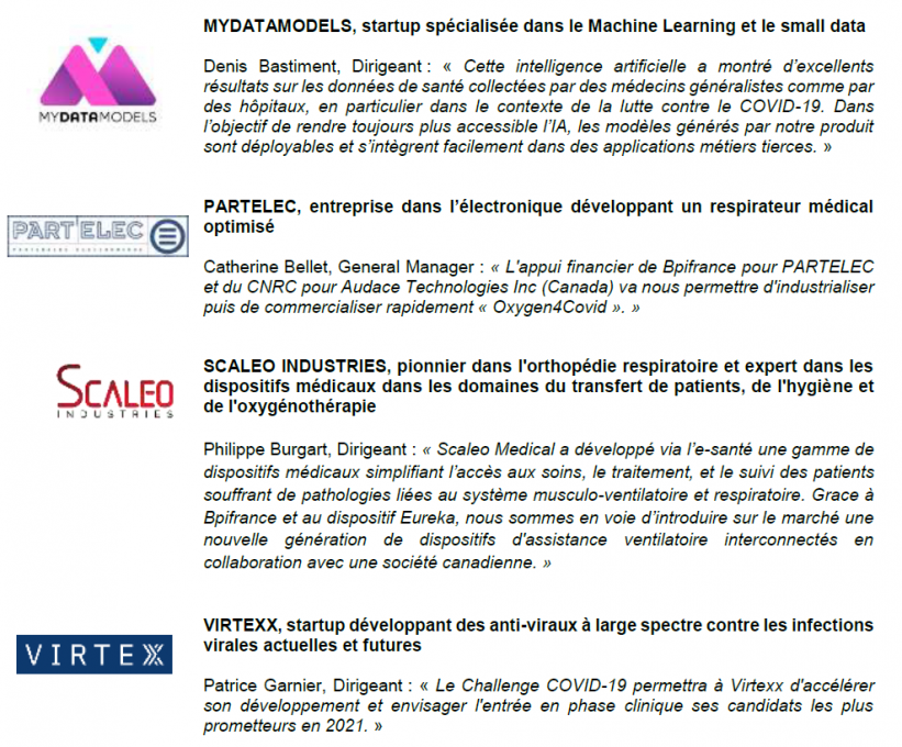 L’appel à projets, ouvert en plein cœur de la pandémie, a reçu plus de 60 candidatures à l’échelle globale, dont 12 impliquant des entreprises françaises. Après instruction par les différentes agences d’innovation à l’origine de ce challenge, 8 startups et PME françaises ont été déclarées lauréates et seront ainsi accompagnées et financées pour mener à bien leurs projets collaboratifs internationaux.
