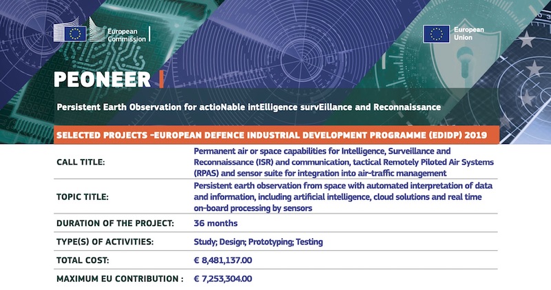 Start-up parisienne spécialiste en IA pour la défense, Earthcube a été sélectionnée par la Communauté Européenne pour son projet PEONEER aux côtés de 9 autres entreprises européennes, dont Airbus Defence and Space (France); Hisdesat Servicios Estrategicos et ATEM NUEVAS TECNOLOGIAS (Espagne); TERMA Group (Danemark), Elsis (Lituanie); Spacemetric (Suède); TOVEK, spol. s r.o (République tchèque); DefSecIntel Solutions (Estonie) et e-GEOS, joint venture de Thales et Leonardo et entreprise détenue à 20 % par l’agence spatiale italienne et à 80 % par Telespazio (Italie).