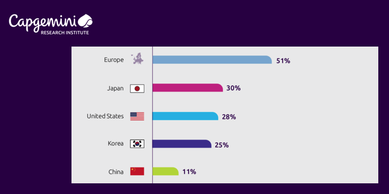 Plus de la moitié des fabricants européens mettent en place des cas d’usage de l’IA : l’Allemagne arrivant en tête avec un taux de 69%, contre 28% pour les Etats-Unis et 11% pour la Chine. C'est ce que démontre une nouvelle étude publiée par le Capgemini Research Institute, qui constate l’avance du marché européen en termes d’intégration de l’intelligence artificielle dans les opérations industrielles.