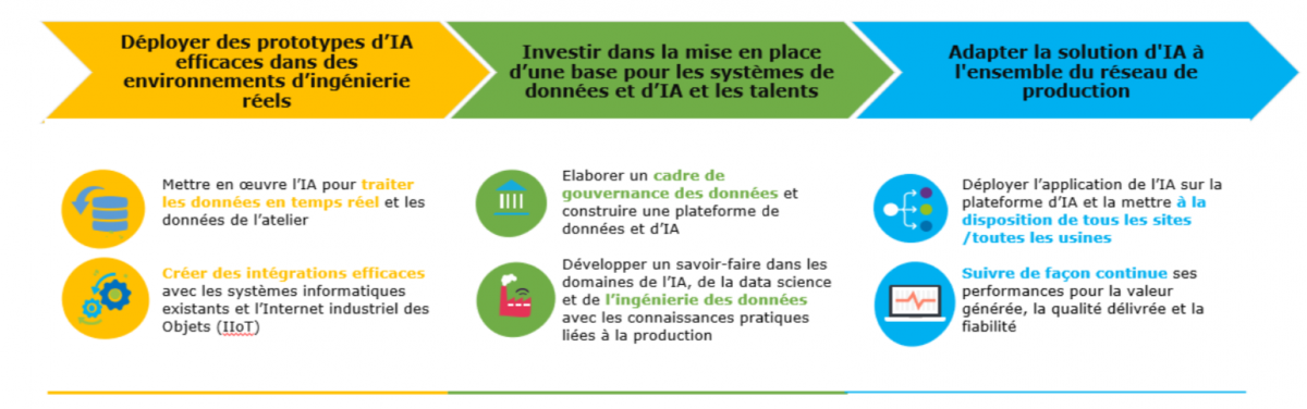 « Avec la maturité de leurs premiers pilotes, nous voyons les grandes entreprises passer de projets pilotes à des déploiements à plus grande échelle », commente Pascal Brosset, directeur des technologies du Digital Manufacturing chez Capgemini. « À juste titre, les organisations concentrent en premier lieu leurs efforts sur les cas d’utilisation capables de leur offrir le retour sur investissement le plus rapide et le plus concret, notamment dans les domaines de l’inspection qualité automatisée et de la maintenance intelligente. »En conclusion de l’étude, des recommandations pour intégrer l’IA dans les activités de production (voir la figure ci-dessous) :« Les dirigeants que nous avons interrogés ont exprimé clairement que ce sont ces fonctions qui peuvent générer des économies rapides, améliorer la précision de la production et éliminer le gaspillage. Cependant parallèlement à leur déploiement, ils se préparent à l'avenir en réinvestissant une partie des économies dans la construction d'une infrastructure de données / IA évolutive et en développant les compétences nécessaires », ajoute-t-il.