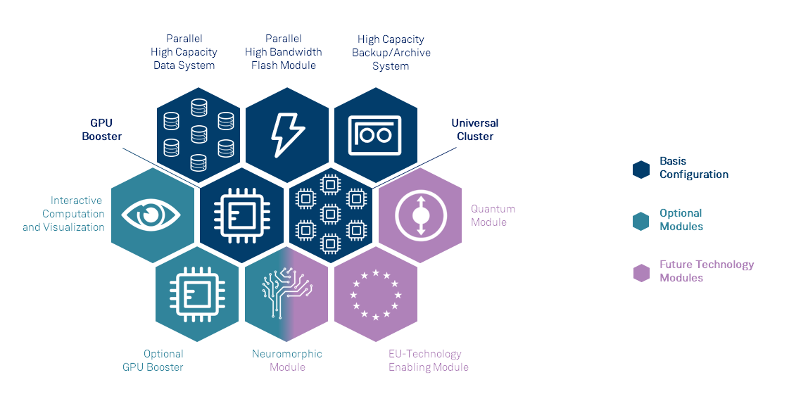 Tout comme l'actuel supercalculateur JUWELS de Jülich, JUPITER sera basé sur une architecture de supercalcul dynamique et modulaire, que le Forschungszentrum Jülich a développée en collaboration avec des partenaires européens et internationaux dans le cadre des projets de recherche DEEP de l'UE.Dans un supercalculateur modulaire, différents modules informatiques sont couplés entre eux, ce qui permet de répartir des parties de programme de simulations complexes sur plusieurs modules et aux différentes propriétés matérielles d'être utilisées de manière optimale dans chaque cas. Jupiter pourra en outre intégrer dans le futur de nouvelles technologies comme l'informatique quantique ou les modules neuromorphiques.