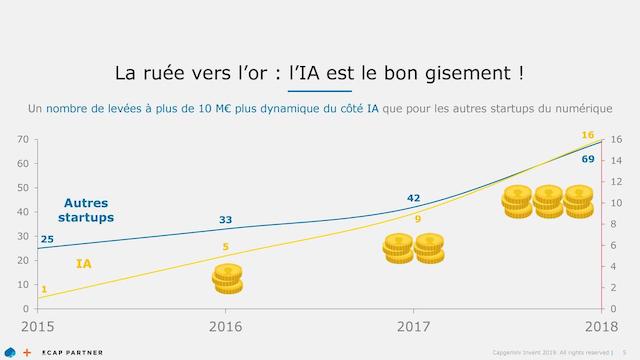 Les startups spécialisées dans l’intelligence artificielle ont le vent en poupe : elles bénéficient non seulement d’une croissance de presque 30% en termes de nombre de levées (contre une stagnation pour les autres jeunes pousses), mais aussi d’un grand nombre de levées dont le montant excède 10 M€ : celui-ci est trois fois supérieur à celui des autres startups.