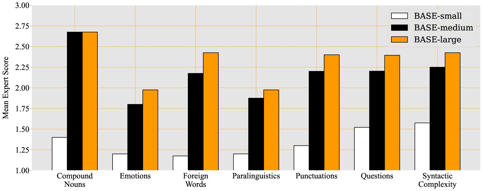 Évaluations d’experts linguistes par système : BASE TTS - petit/moyen/grand. Les résultats sont présentés pour les sept tâches proposées, en calculant la moyenne des notes d’experts sur 20 phrases dans chaque catégorie.