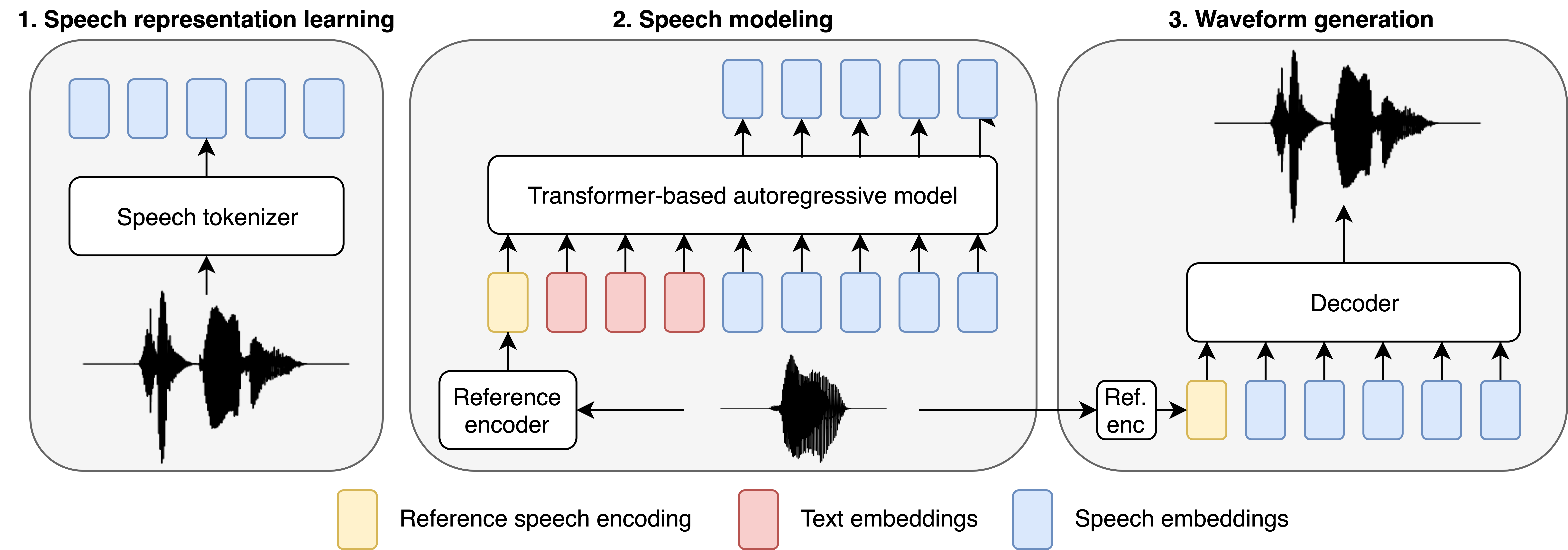Vue d’ensemble de BASE TTS. Le générateur de jetons vocaux (1) apprend une représentation discrète, qui est modélisée par un modèle autorégressif (2) conditionné par le texte et la parole de référence. Le décodeur speechcode (3) convertit les représentations vocales prédites en forme d’onde.