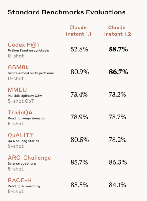 Anthropic a comparé les 2 versions : Claude Instant 1.2 surpasse Claude Instant 1.1 en mathématiques et en codage, atteignant 58,7% à l’évaluation du Codex contre 52,8% pour le modèle précédent. Il a également obtenu un score de 86,7% sur le benchmark GSM8K, contre 80,9% pour Claude Instant 1.1.Sur les autres tests de référence menés, il enregistre des pertes minimes sauf sur ARC-Challenge où il obtient un petit gain de 0,6%.