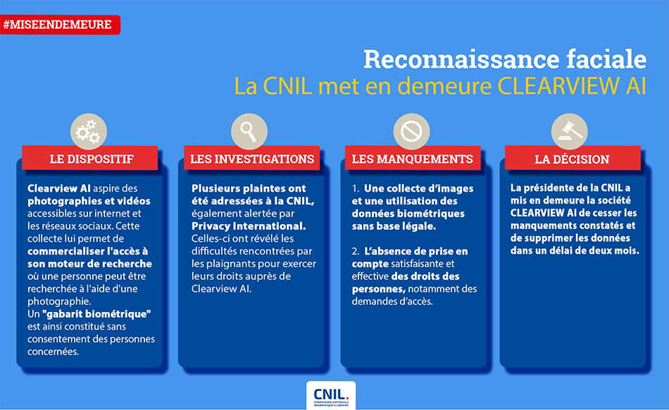La société américaine Clearview AI a développé un logiciel de reconnaissance faciale dont la base de données repose sur l’aspiration de photographies et de vidéos publiquement accessibles sur internet. Elle aurait ainsi récolté plus de 10 milliards de photos "sans base légale", ce que lui reproche la Commission Nationale de l'Informatique et des Libertés (CNIL) qui l’a mise en demeure de cesser ce traitement illicite et de supprimer les données dans un délai de deux mois.