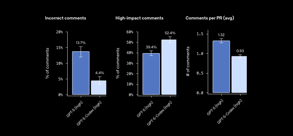 OpenAI a évalué ses performances en s’appuyant sur des validations récentes de dépôts open source populaires. Chaque révision a été examinée par des ingénieurs logiciels expérimentés, chargés d’en évaluer la pertinence et l’exactitude. Ils ont constaté une nette amélioration par rapport aux versions précédentes : moins de commentaires incorrects et plus de suggestions efficaces.