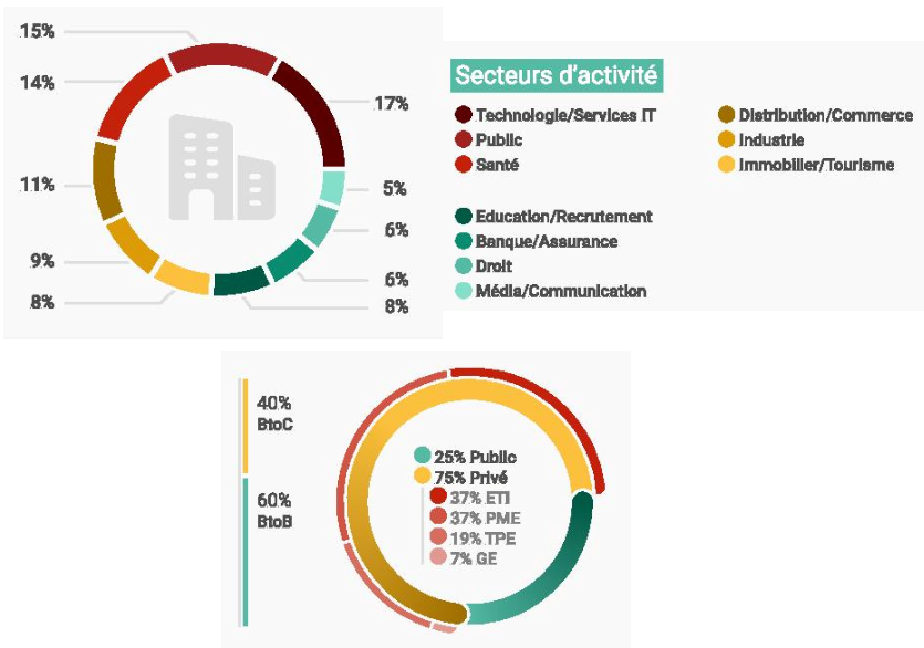 En haut, le secteur d'activité des professionnels interrogés, en bas, la proportion d'individus provenant du secteur privé ou public.[/caption]