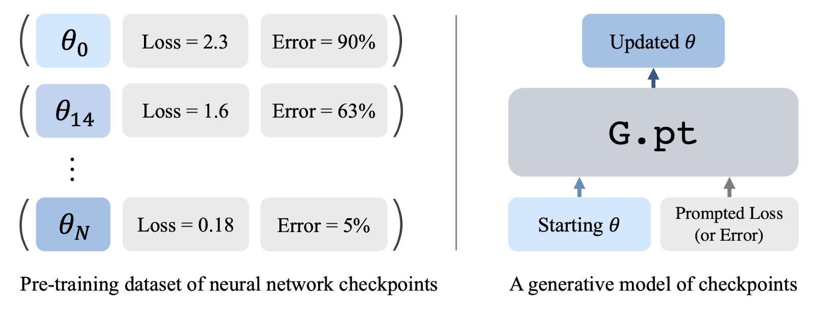 Pré-entraînement génératif à partir de points de contrôle. A gauche : construction d'un ensemble de données des points de contrôle de réseau neuronal. Chaque point de contrôle inclut les paramètres du réseau neuronal et métadonnées pertinentes (pertes et erreurs de test pour les tâches d’apprentissage supervisé, retours pour les tâches RL). A droite: G.pt, un modèle génératif de points de contrôle. G.pt prend un vecteur paramètre et une perte/erreur/retour invite en tant qu’entrée et prédit la distribution sur les paramètres mis à jour qui permettent d’obtenir l’invite.[/caption]