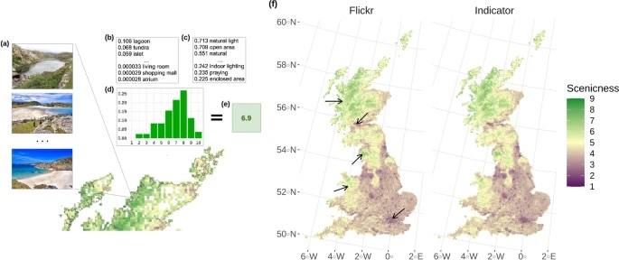 Les images Flickr et l'IA ont permis de générer une mesure globale de la qualité esthétique du paysage par zone. © Ilan Havinga (photos Sergio and Graeme Churchard (cc-by/2.0)[/caption]