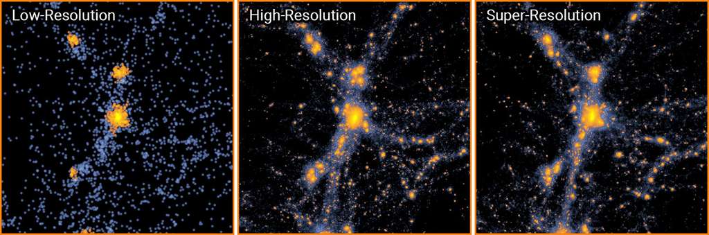 Grâce à des réseaux de neurones antagonistes génératifs (GAN), les chercheurs ont mis au point un modèle de super-résolution pour améliorer la qualité des simulations de basse définition. À partir d'images de haute résolution, ces GAN se sont entrainés pour ensuite créer des versions de super-résolutions précises de différentes images de basse résolution.Un des réseaux prend pour point d'ancrage une simulation basse résolution et invente ensuite ses propres techniques pour multiplier la résolution de l'image par 512. Un second réseau devine si la technique utilisée est nouvelle ou si le réseau initial a utilisé une méthode déjà utilisée précédemment. La technique est réitérée aussi longtemps que nécessaire afin que la simulation soit de haute résolution et devienne, par la suite, de super résolution, comme le montre le schéma ci-contre :