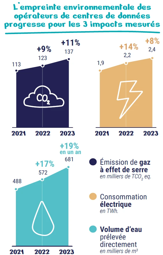 Les résultats sont sans ambiguïté : la consommation électrique du secteur progresse encore, avec une hausse en 2023 de près de 8 %. Les émissions de gaz à effet de serre, majoritairement liées à l’électricité, augmentent d’environ 10 % par an pour la deuxième année consécutive. La consommation d’eau, essentielle au refroidissement, croît quant à elle de 19 % : 681 000 m³, majoritairement d'eau potable, ont été prélevés.