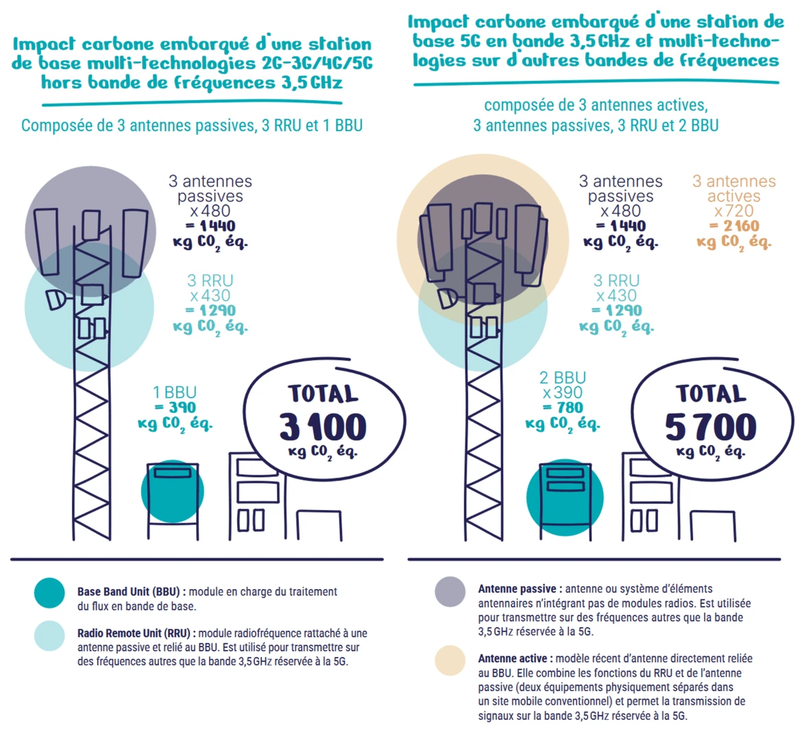 Les résultats montrent que les émissions "embarquées" des stations de base des équipementiers sont significatives : l’empreinte carbone d’un site 5G en bande 3,5 GHz est évaluée à 80 % de plus que celle d’un site sans cette bande. Autrement dit, les choix technologiques influencent directement l’impact environnemental des infrastructures.