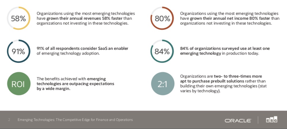 Cette nouvelle enquête mondiale réalisée par Enterprise Strategy Group et Oracle précise notamment que les technologies émergentes (IA, Internet des Objets (IoT), blockchain, assistants numériques) ont dépassé le stade de l'adoption, surpassent les attentes qu'elles ont pu susciter et constituent de véritables avantages concurrentiels.