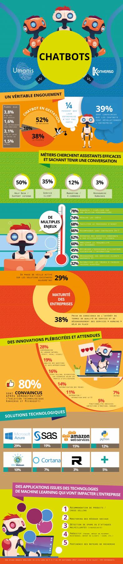 Umanis, leader français en Data, Digital & Business Solutions a mené une enquête auprès des entreprises présentes lors de son événement « 5 à 7 Chatbots », réalisé l'an dernier avec Konverso. Il a dévoilé les résultats sous la forme d’une intéressante infographie accompagnée du communiqué ci-dessous.