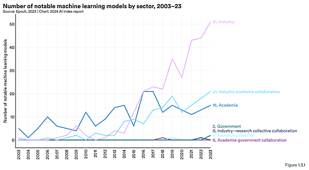 En 2023, l’industrie a produit 51 modèles d’apprentissage automatique notables, contre 15 pour le monde universitaire. Il y a également eu 21 modèles remarquables résultant de collaborations entre l’industrie et le milieu universitaire en 2023, ce qui constitue également un nouveau record.