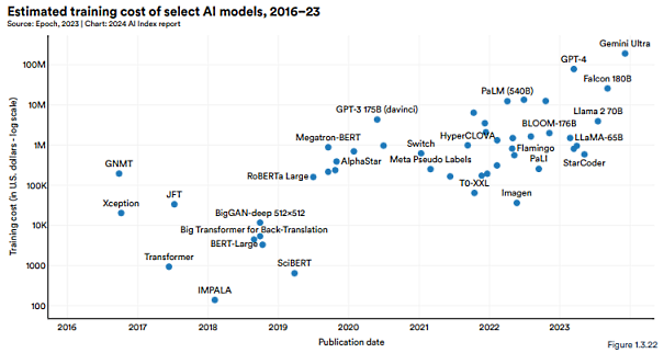 Selon les estimations de l’AI Index, les coûts d’entraînement des modèles d’IA de pointe ont atteint en 2023 des niveaux sans précédent. Ainsi l'entraînement de GPT-4 d’OpenAI a coûté environ 78 millions de dollars tandis que celui de Gemini Ultra de Google a atteint un nouveau sommet, revenant à 191 millions de dollars.
