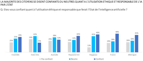 Menée auprès de plus de 6 000 citoyens en Australie, France, Allemagne, à Singapour, au Royaume-Uni et aux Etats-Unis, cette enquête montre que 45 % des citoyens sont aujourd’hui plus favorables à l’utilisation de l’IA qu’ils ne l’étaient il y a un an ; 43 % déclarent que leur degré d’appréhension vis-à-vis de l’IA reste inchangé ; et 12 % se disent aujourd’hui moins favorables à l’IA qu’ils ne l’étaient un an auparavant.