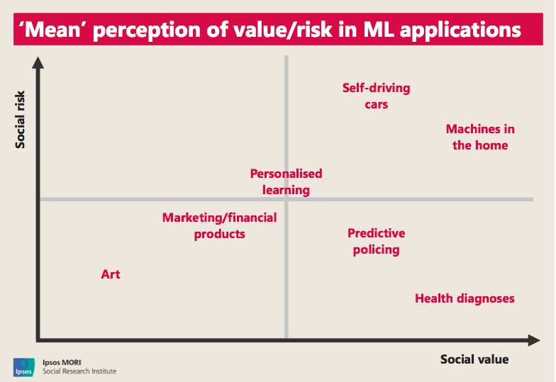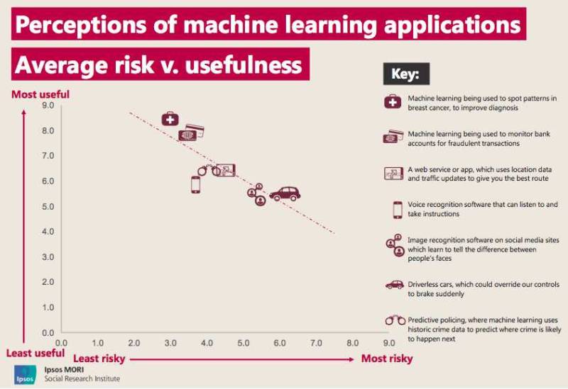 On y découvre que les Anglais sont relativement optimistes concernant le machine learning mais surtout qu'ils sont plus effrayés par l'intelligence artificielle dans leurs outils du quotidien ou dans leurs véhicules que par les systèmes intelligents qui pourraient être utilisés par la police ou les médecins.