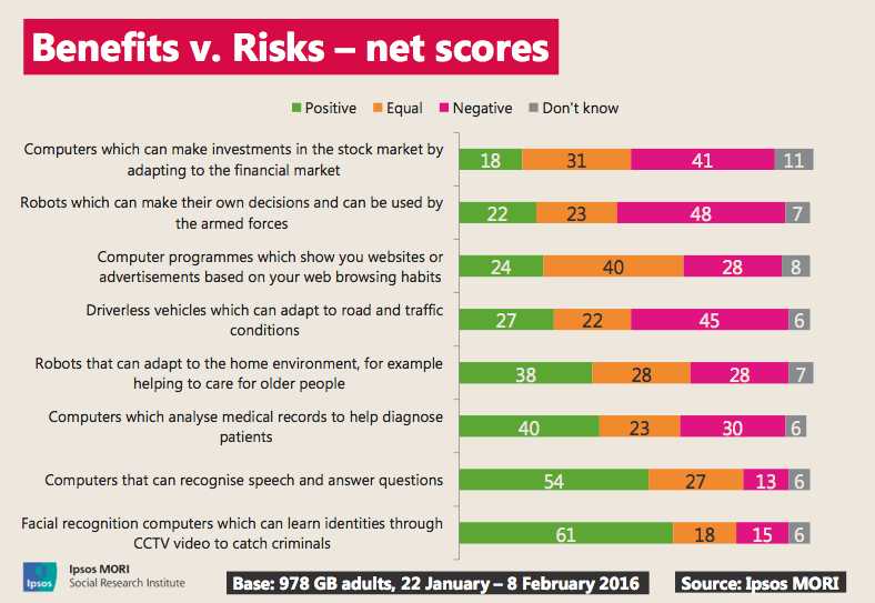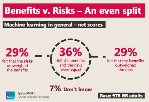 Selon ce sondage, un tiers des personnes interrogées pensent que les risques liés à l'intelligence artificielle sont plus importants que les avantages qu'elle apporterait, tandis que 36% pensent que risques et avantages sont à égalité. Les principaux risques mis en avant concernent l'emploi, les accidents, l'entrave aux libertés, l'augmentation des inégalités et une expérience humaine dévaluée.