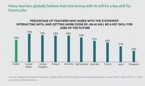 58% des enseignants du secondaire de ces pays estiment que l’interaction avec les systèmes d’IA sera une compétence requise pour les emplois à venir. Les enseignants en lycée sont plus nombreux à penser que l’IA sera une compétence clé (62 % contre 46 % des enseignants du collège). Cette vision diffère également selon les pays, avec seulement 29 % des enseignants à Singapour qui partagent cet avis par rapport à 74 % des enseignants américains.