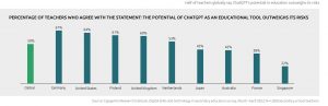 Selon le rapport, la majorité (61%) des enseignants ont expérimenté ChatGPT pour des raisons professionnelles, le pourcentage le plus haut (70%) concerne les États-Unis , le plus faible (52%) Singapour et les Pays-Bas.Les enseignants masculins (71%) utilisent plus ChatGPT que les enseignantes (59%). Plus d'un tiers (37%) des enseignants qui ont utilisé ChatGPT l'ont fait pour gagner du temps dans leur travail.