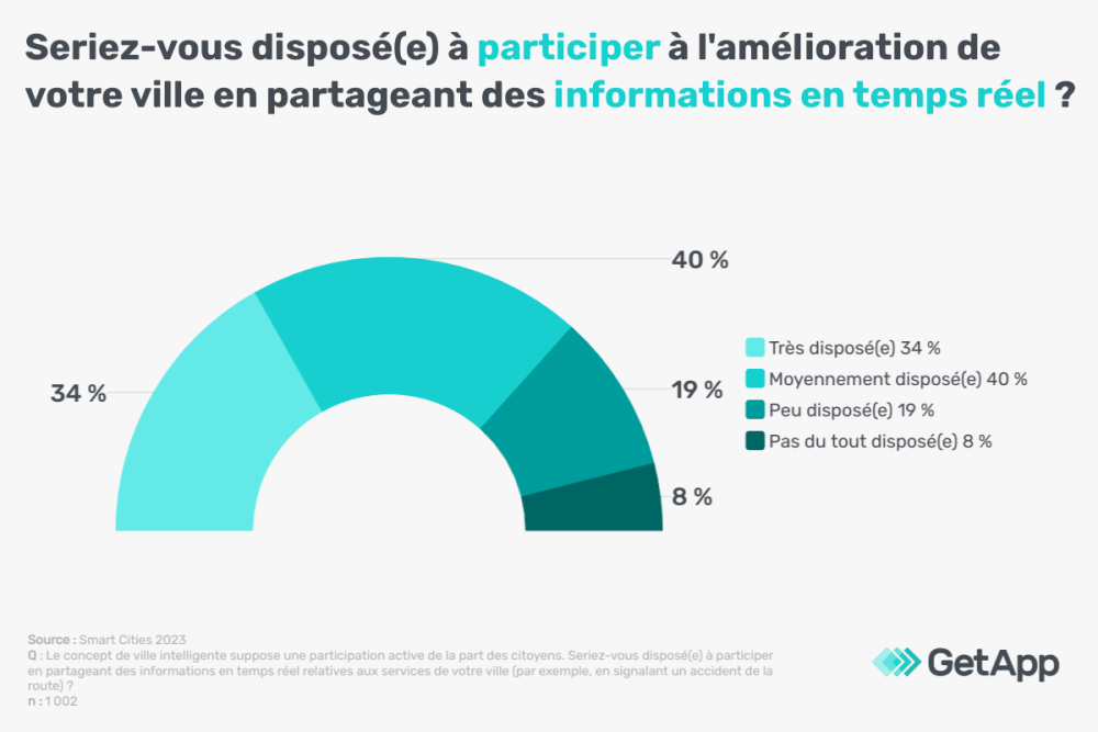 Le concept de ville intelligente implique une participation active des citoyens, cette perspective suscite divers degrés d'intérêt parmi les citadins. Alors que 34 % expriment un fort intérêt à partager des informations en temps réel sur les services de leur ville, 40 % se montrent moyennement disposés à s'impliquer. Seulement 8 % sont complètement réfractaires à cette idée.