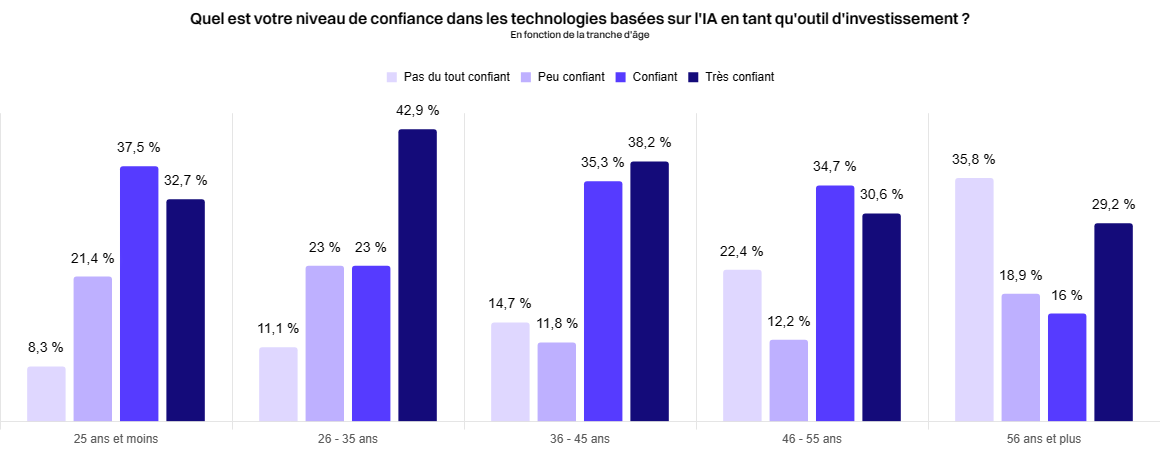 - 42,9 % des français entre 26 et 35 ans et 38,2 % des 36 à 45 ans expriment la plus grande confiance envers l'IA en tant qu'outil d'investissement ;