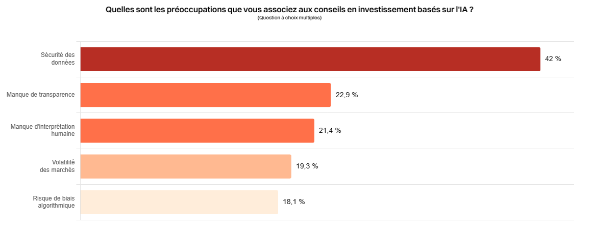 L'intégration croissante de l'intelligence artificielle comme outil d'investissement suscite des interrogations quant aux risques qui peuvent en résulter. À la question, « Quelles sont les préoccupations que vous associez aux conseils en investissement basés sur l'IA ? », les sondés répondent :- La sécurité des données (42%) ;