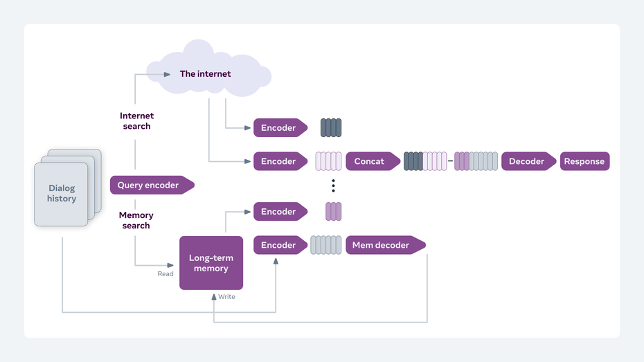 Facebook AI Research (FAIR), le laboratoire de recherche sur l'intelligence artificielle de Facebook, a travaillé sur BlenderBot 2.0, un chatbot qui combine mémoire à long terme et informations récupérées en direct sur internet. Il s'agit d'une mise à jour importante du Blender Bot original qui avait déjà été conçu en 2020 et qui était connu pour prendre en compte plus de paramètres que des chatbots plus classiques comme la personnalité, l'empathie ou la culture. L'outil a été publié en open source.