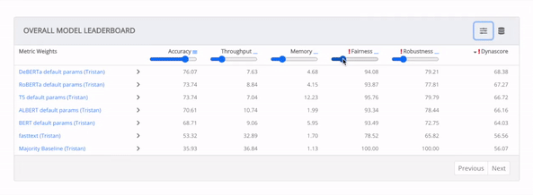 Dynaboard introduit un tout nouvel indicateur intitulé Dynascore : il prend en compte plusieurs axes d'évaluation afin de proposer un résultat qui précisera la qualité du modèle NLP.Voici les axes d'évaluations pris en compte par Dynascore :