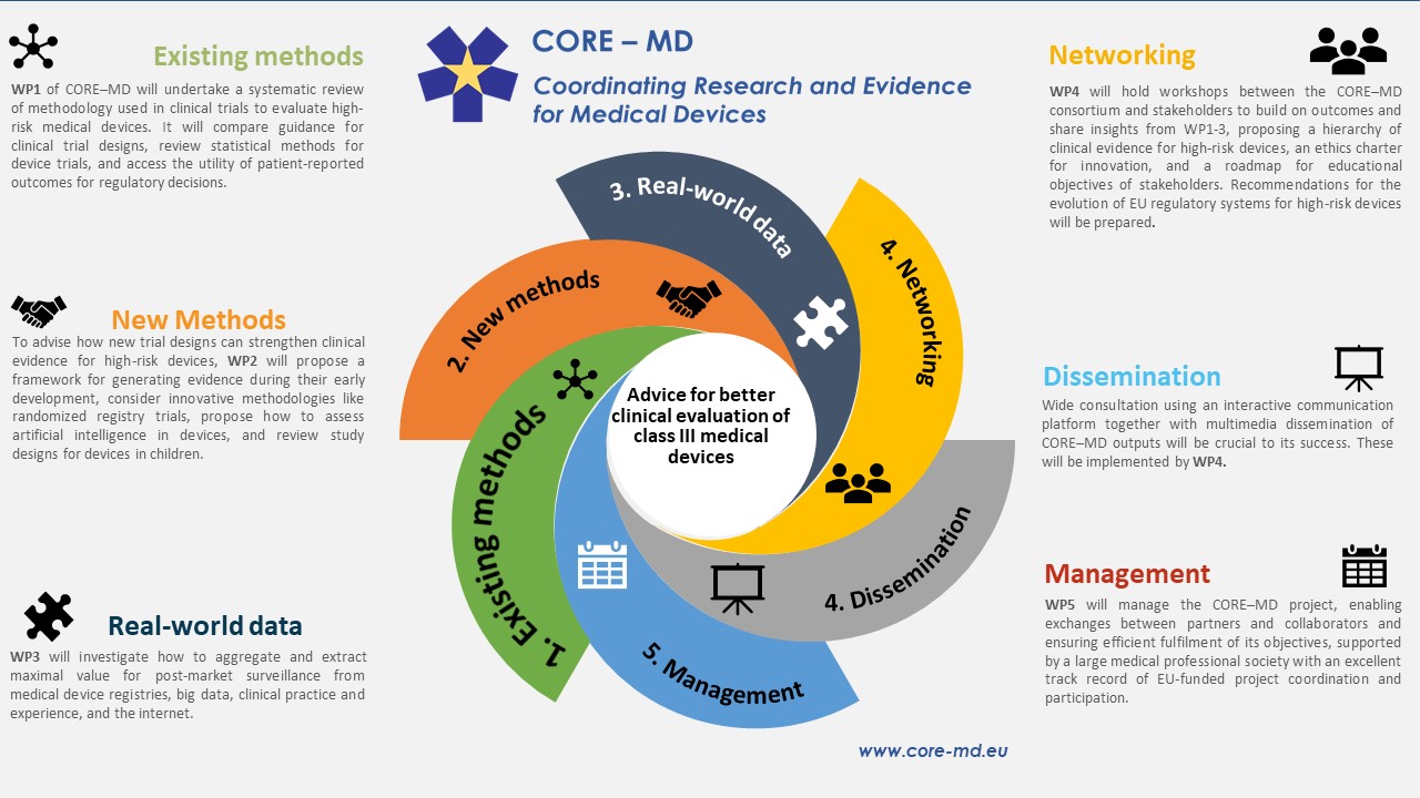 Le projet CORE-MD a été lancé dans le cadre d'une étroite collaboration entre la Fédération européenne des associations nationales d’orthopédie et de traumatologie et la Société européenne de cardiologie. Il s'inscrit dans le programme de recherche et d’innovation Horizon 2020 de l’Union européenne. À travers ses recherches, l'équipe de CORE-MD a pour objectif de réaliser une revue des méthodes d'évaluation des dispositifs médicaux à haut risque et notamment les algorithmes d’intelligence artificielle.