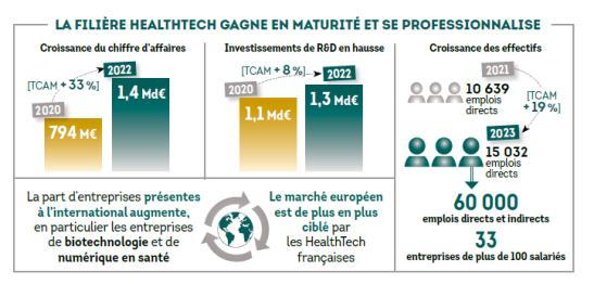 Selon France Biotech, un des premiers constats est une accélération des entreprises en santé numérique : leur nombre a doublé en quatre ans et est passé de 200 en 2019 à 450 en 2023 avec la création de 50 entreprises en 2023. Le nombre d’entreprises au stade de commercialisation augmente et atteint 77% en 2023 ; ces entreprises sont également de plus en plus présentes sur les marchés internationaux. Le principal frein à lever est de trouver un modèle économique pérenne pour les entreprises de ce domaine.La filière HealthTech gagne en maturité et se professionnalise