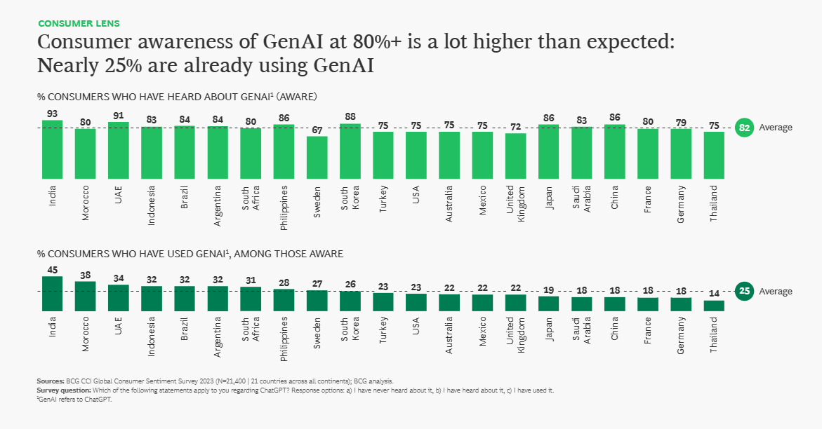 Le rapport révèle que seulement 7 % des employés chinois et 11 % des employés indiens expriment une inquiétude vis-à-vis GenAI, contre 18 % aux Etats-Unis et 19 % en Allemagne).Quant aux consommateurs de ces pays, les chiffres sont sensiblement les mêmes : 9 % des consommateurs chinois et 11 % des consommateurs indiens sont inquiets sur le sujet, contre 40 % aux Etats-Unis et 39 % en Allemagne.