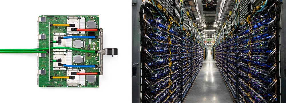 À gauche : un plateau à puce utilisé pour le TPUv4, à droite : le centre de données de Google dans l'Oklahoma[/caption]