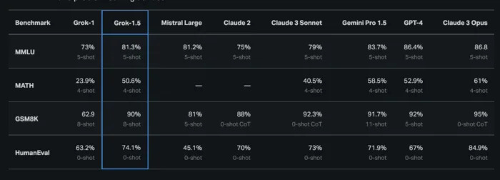 Les performances de Grok 1 ont été particulièrement améliorées dans les tâches liées au codage et aux mathématiques. Lors des tests réalisés par xAI, Grok-1.5 a obtenu un score de 50,6 % sur le benchmark MATH et un score de 90 % sur le benchmark GSM8K, deux benchmarks mathématiques couvrant un large éventail de problèmes de compétition de l’école primaire au lycée. Sur GSM8K, il a surpassé Mistral Large et Claude 2 en 8 shots.Sur le benchmark MMLU (Massive Multitask Language Understanding) qui utilise une combinaison de 57 matières telles que les mathématiques, la physique, l’histoire, le droit, la médecine et l’éthique pour tester à la fois les connaissances du monde et les capacités de résolution de problèmes, il les a également surpassés en 5 shots ainsi que Claude 3 Sonnet. Sur le benchmark HumanEval, qui évalue les capacités de génération de code et de résolution de problèmes, où il a obtenu un score de 74,1 %, il a surpassé les 3 modèles ainsi que Gemini Pro 1,5 et GPT-4 sans essai préalable (zéro shot).