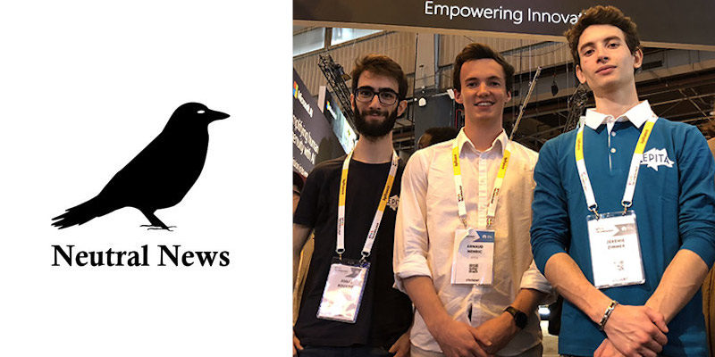 Le vendredi 25 mai 2018, alors en 1e année du cycle ingénieur de l’EPITA, les trois étudiants co-fondateurs de Neutral News, Jonas Bouaziz, Arnaud Henric et Jérémie Zimmer (EPITA promo 2020) remportaient la 3e place du concours Imagine Cup 2018 organisé par Microsoft, à l’occasion du salon Viva Technology. Une étape décisive dans la réalisation de leur projet. Arnaud Henric, co-fondateur, revient sur l’origine de cette aventure :« Nous avons découvert le concours Microsoft Imagine Cup lors d’une conférence à l’EPITA au cours d’une semaine consacrée à l’intelligence artificielle en février 2018. C’est un domaine technologique attrayant et d’autant plus crucial à nos yeux dans un contexte de prolifération des “fake news”. C’est pourquoi, après quelques échanges, nous avons souhaité saisir l’opportunité de développer une solution d’analyse de l’information ; un sujet dans l’ère du temps. »Actuellement soutenus par l’EPITA, ils ont pu depuis juillet 2018 réaliser leur stage de quatrième année en mode développement de leur start-up. Les étudiants ont l’ambition de continuer leurs études en parallèle de leur projet entrepreneurial.