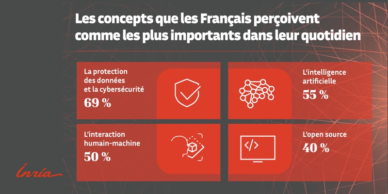 Cette enquête montre la place importante prise par le numérique dans la vie des Français, ainsi, 82 % d'entre eux estiment que la formation à ses enjeux est essentielle. Les concepts perçus comme primordiaux dans le quotidien des Français sont la protection des données et la cybercriminalité pour 69 % d'entre eux, viennent ensuite l'IA pour 55 %, l'interaction homme /machine pour 50 % et l'open source pour 40 %.Laurent Stencel, directeur communication à l'Inria, conclut :