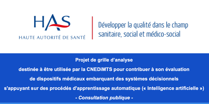 Pour ce nouveau champ d’évaluation, la HAS estime qu’une approche collective est nécessaire : ce projet de grille est donc soumis à consultation publique jusqu’au 15 janvier 2020. L’objectif est de recueillir les avis et suggestions de tous les acteurs impliqués dans le développement ou l’utilisation de dispositifs médicaux intégrant des algorithmes apprenants : industriels, associations de patients, collèges nationaux professionnels, mais également développeurs de solutions informatiques, chercheurs, instituts Interdisciplinaires d'Intelligence Artificielle (3IA) …Il s’agit pour la HAS d’apprécier la lisibilité de ce projet de grille et la pertinence de chacun des items identifiés. Toutes les contributions seront analysées afin d’aboutir à la version finale de la grille d’analyse qui sera exploitée dans le cadre des futures demandes par les industriels de prises en charge par l’assurance maladie de leurs dispositifs médicaux. Cette grille devrait être définitivement adoptée et appliquée en avril 2020.