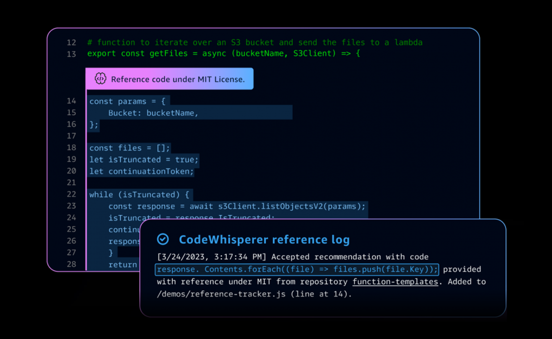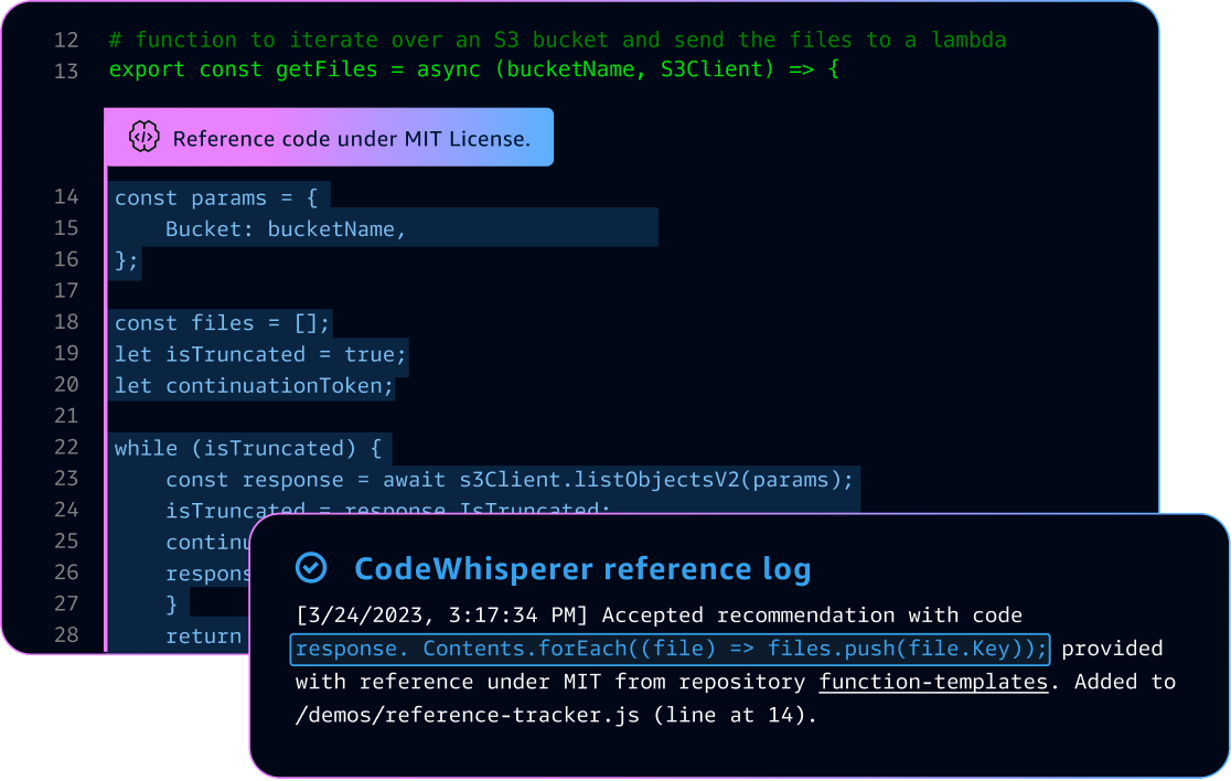 CodeWhisperer intègre un outil de suivi de référence qui détecte si une suggestion de code est similaire à des données d’apprentissage open source. Ces suggestions sont annotées avec l’URL du référentiel du projet open source, la référence du fichier et les informations de licence.