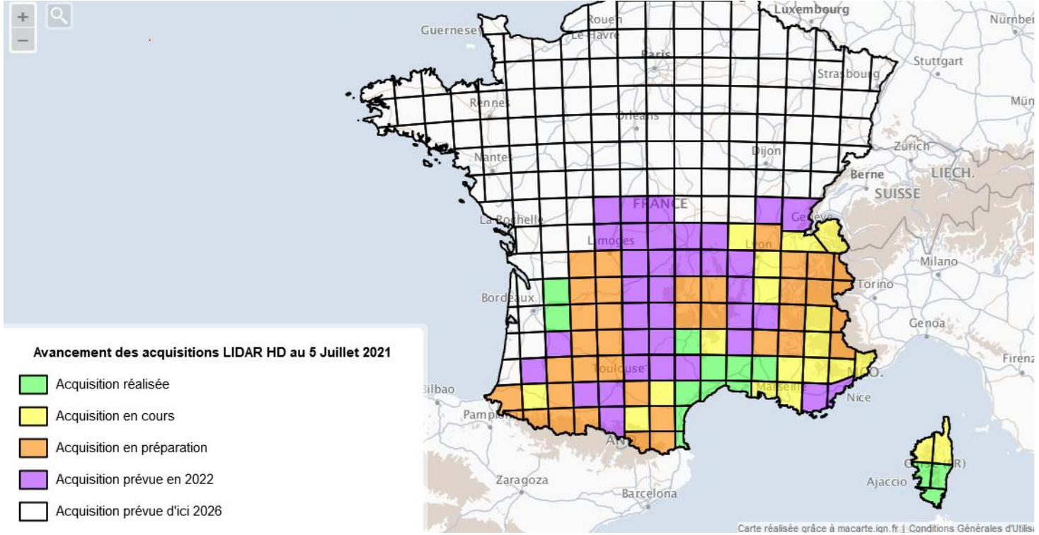 Comme on peut le remarquer, la route est encore longue puisque d'ici 2022, seuls 40 % du territoire français (la moitié sud) aura subi l'ensemble des chantiers d'acquisition nécessaire à la réalisation de la cartographie 3D. À l'heure actuelle, seuls la Corse du Sud, le littoral languedocien et une partie de la Gironde et de la Dordogne voient une acquisition totale d'ores et déjà réalisée.