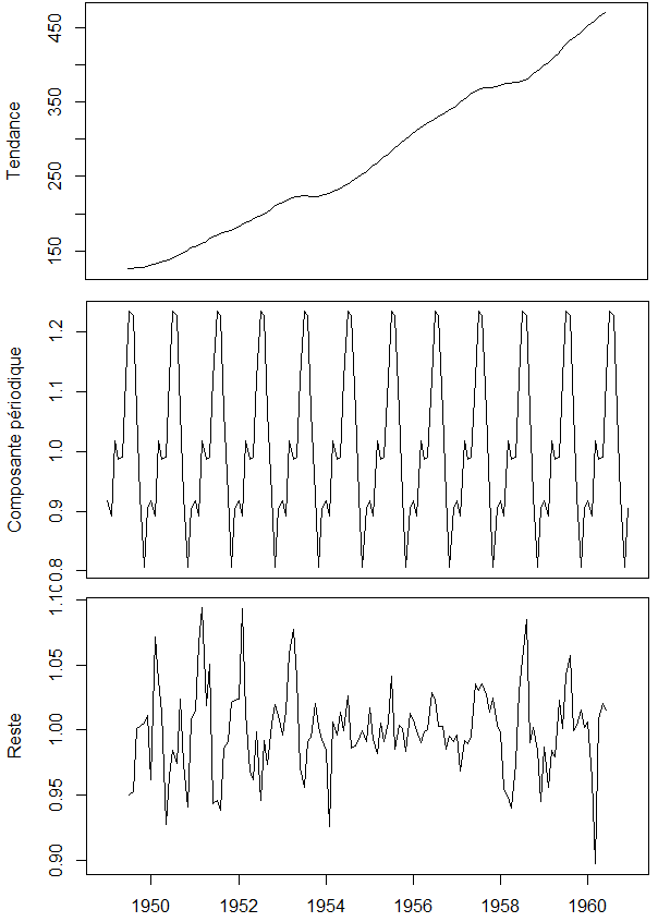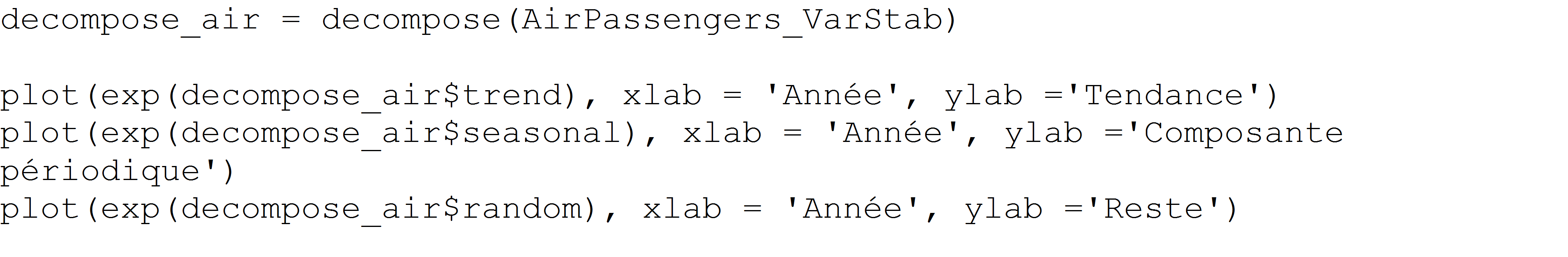 La décomposition d’une série temporelle consiste à séparer sa série initiale en plusieurs sous-séries plus simples, chacune représentant un aspect essentiel de la série initiale. Une décomposition typique est la décomposition en 3 séries: tendance, périodique et reste. On retrouve la série originale si on somme les 3 séries composantes.Dans le graphe ci-dessous on sépare les composantes de tendance, périodique, et le reste avant de les afficher. Notez que l’on applique la décomposition à la série dont la variance a été stabilisée) afin d’avoir une composante périodique qui reste stable dans le temps. Pour l’affichage, on inverse la transformation logarithmique (avec la fonction ‘exp’) pour avoir les données dans l’unité originale.