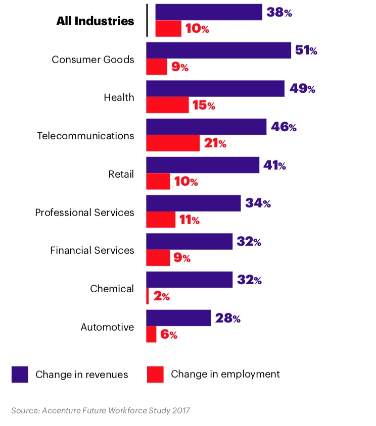 En faisant évoluer leur organisation pour mieux préparer leurs collaborateurs à la collaboration homme-machine, les entreprises pourraient augmenter leur chiffre d’affaires de 38% et leurs effectifs de 10%, d’ici 2022.