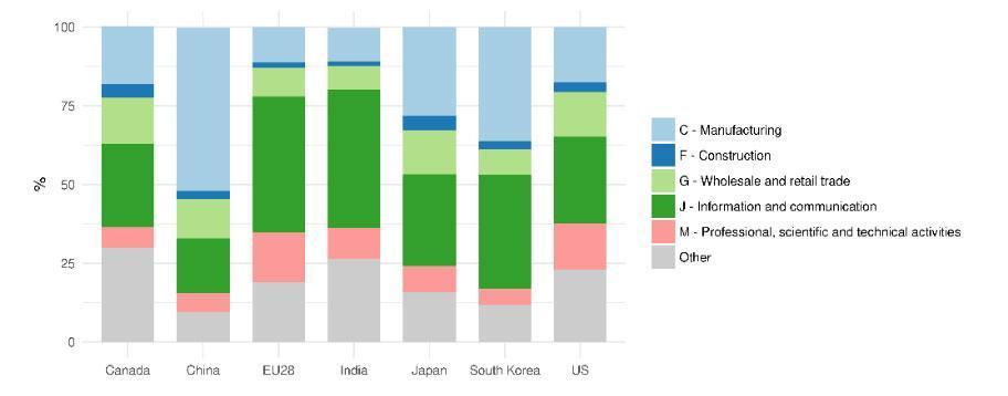 Un autre graphique permet de mettre en évidence les secteurs dans lesquels l'intelligence artificielle est exploitée. Si en Europe, en Inde, au Canada ou aux États-Unis, les entreprises spécialisées en IA opèrent beaucoup plus dans les domaines de l'information-communication ou dans les activités professionnelles, scientifiques et techniques, en Chine, la moitié des entreprises d'IA proviennent du secteur de la manufacture.