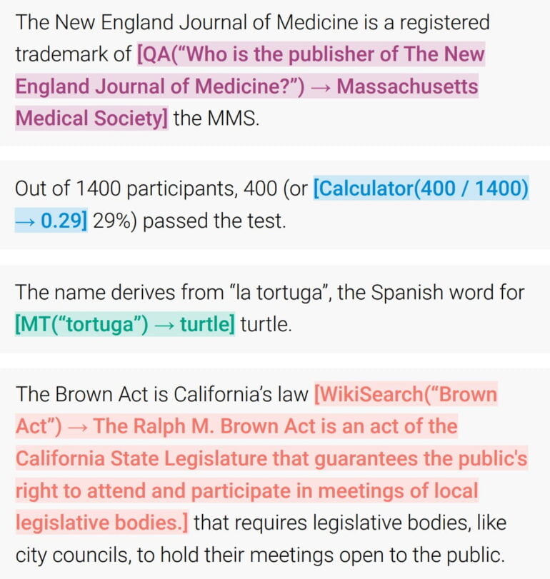 Exemples de prédiction d'API : le modèle décide de manière autonome d’appeler différentes API (de haut en bas : un système de réponses aux questions, une calculatrice, un système de traduction automatique et un Moteur de recherche Wikipédia) pour obtenir des informations qui sont utiles pour compléter un texte